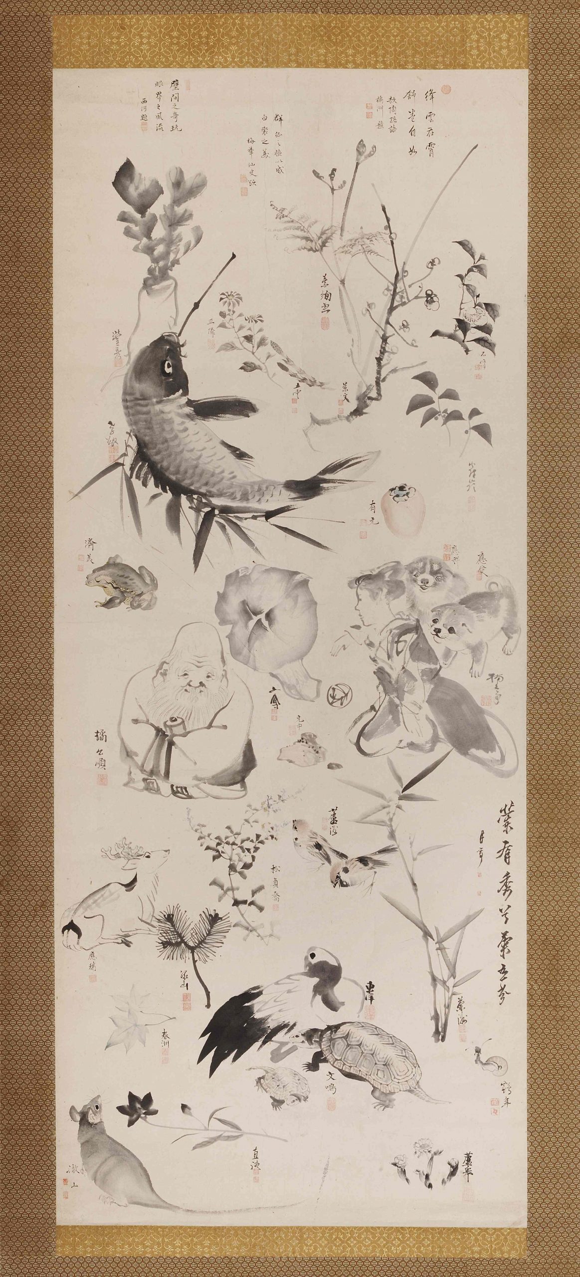 Gemeinschaftswerk von Yoshimura Kōkei (1769–1836), Mori Tetsuzan (1775–1841) und 30 weiteren Künstlern, Japan, Kyōto, vor 1805, Hängerolle, Tusche und leichte Farben auf Papier, 135,7 x 56,4 cm. Erworben 2009. © DGOK, Foto: Jürgen Liepe